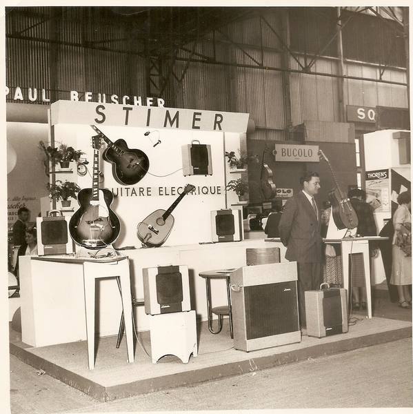 ves Guen sur son Stand Stimer, présente ses nouvelles créations : A l’extrême gauche, l’ampli M 10, le pickup S 51 monté sur une guitare Manouche Mouly Jim à barrettes inclinées, puis le M 12 et un ampli de 45 W le S 77 fait pour Django pour ses séances à la radio.
