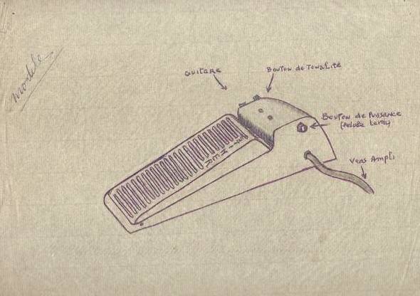 A gauche de la photo, vous pouvez remarquer la première guitare solid body Stimer. Elle a un manche conducteur avec un seul micro (le manche a été fabriqué par Favino, le célèbre luthier). Présentation des micros Stimer ST 48 et S 51 ainsi que des Amplis M 6 et M10 .