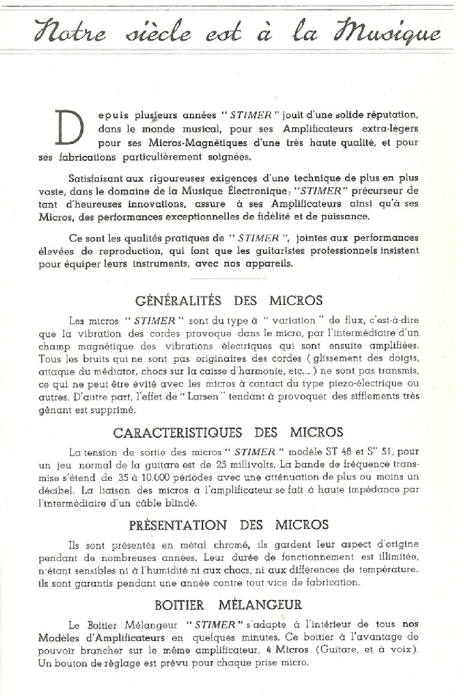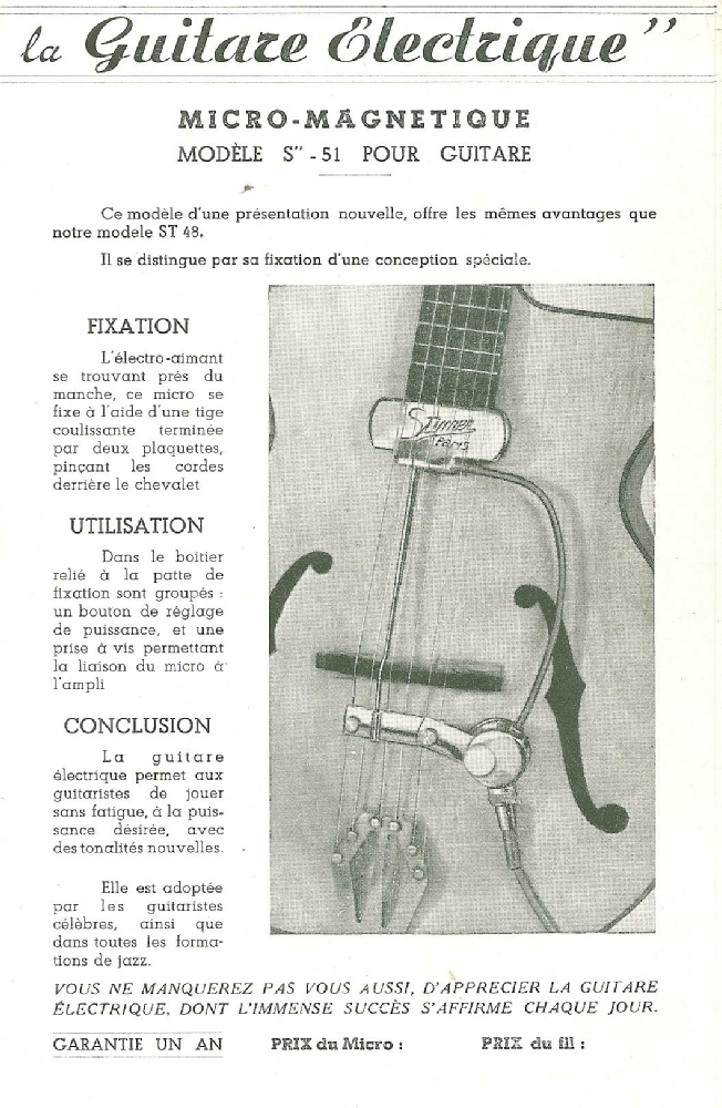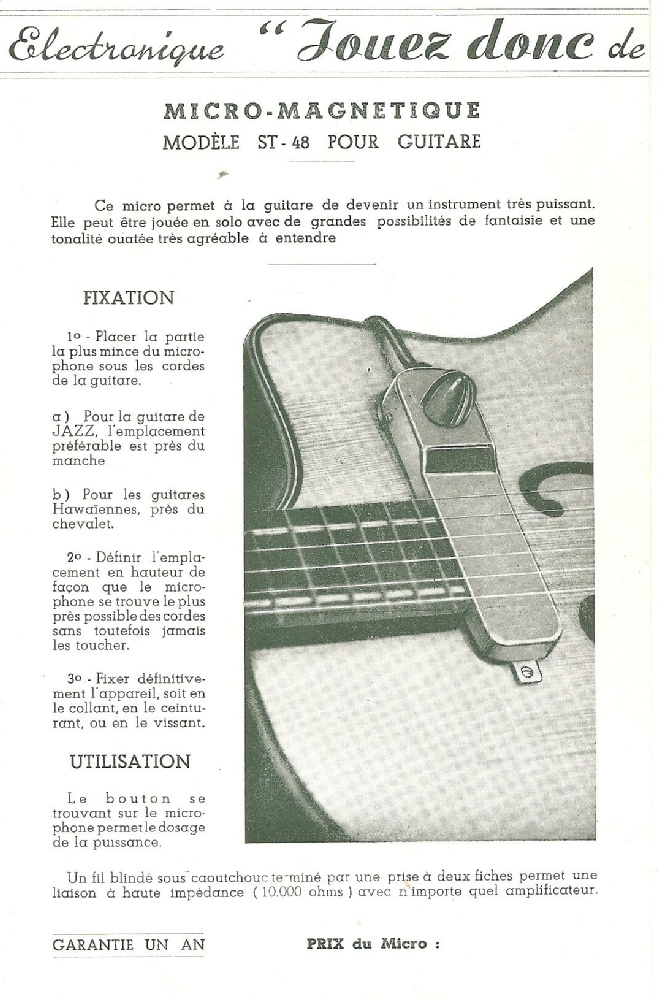 e ST48 : c’est un micro pour guitare électro acoustique simple bobinage, avec un réglage de volume directement sur le micro. Le bobinage est effectué à la main, le bouton de volume changera de forme et de couleur au cours des années. Sur les premiers modèles, le câble blindé sort directement du micro; ensuite, il sera remplacé par une prise à vis, une prise mini jack et enfin par une prise Rca.