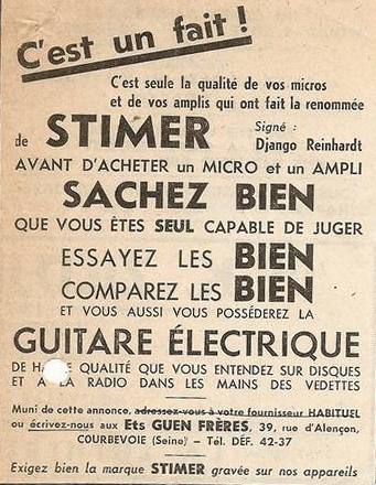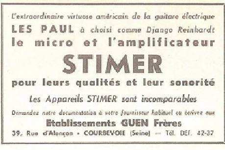 es Paul, lors de son passage à Paris est accompagné par Django Reinhardt et achète nos micros et nos Amplis pour mettre sur ses guitares.