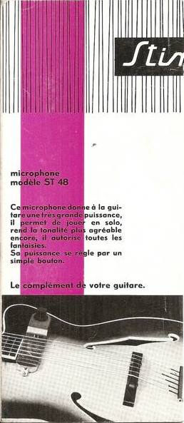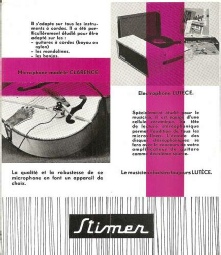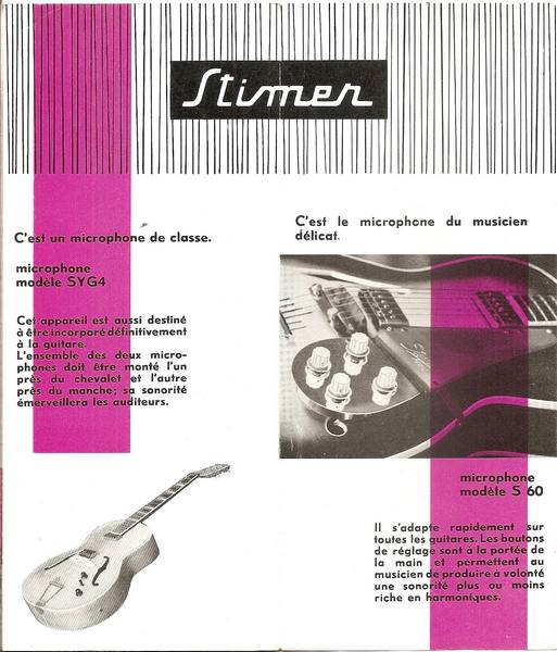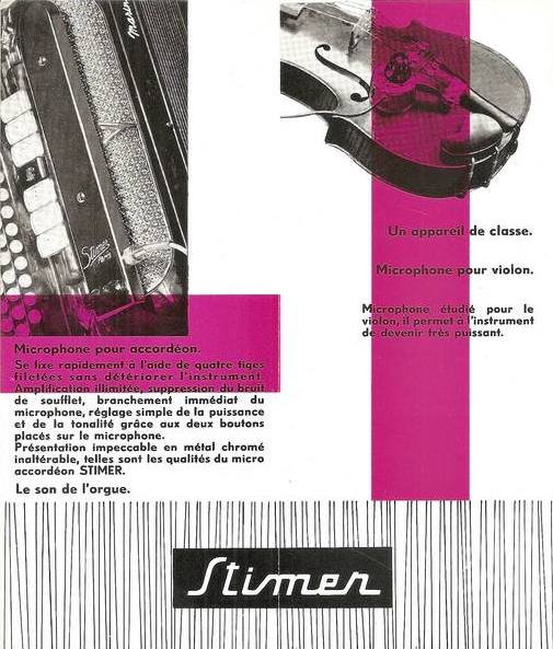 ans cette publicité Stimer de 1960 : le ST 48, S 51, le Django, le SYG2, le SYG4, le S 60, le micro accordéon Standard, le micro Violon, le micro Clarence et l’électrophone Lutèce.